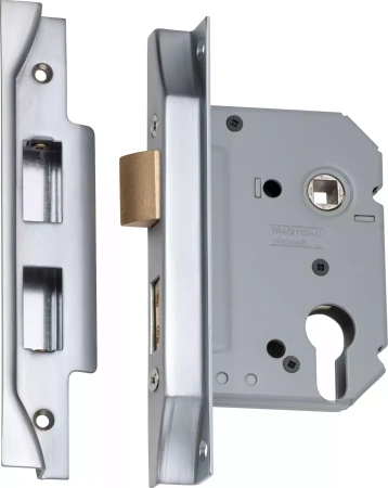 High security rebated euro mortice lock with 48mm pitch (centres from handle spindle to key cylinder). Suits most common lever on plate furniture sets
